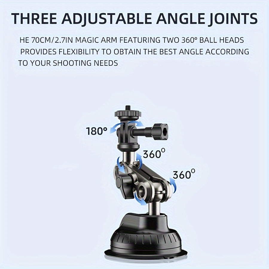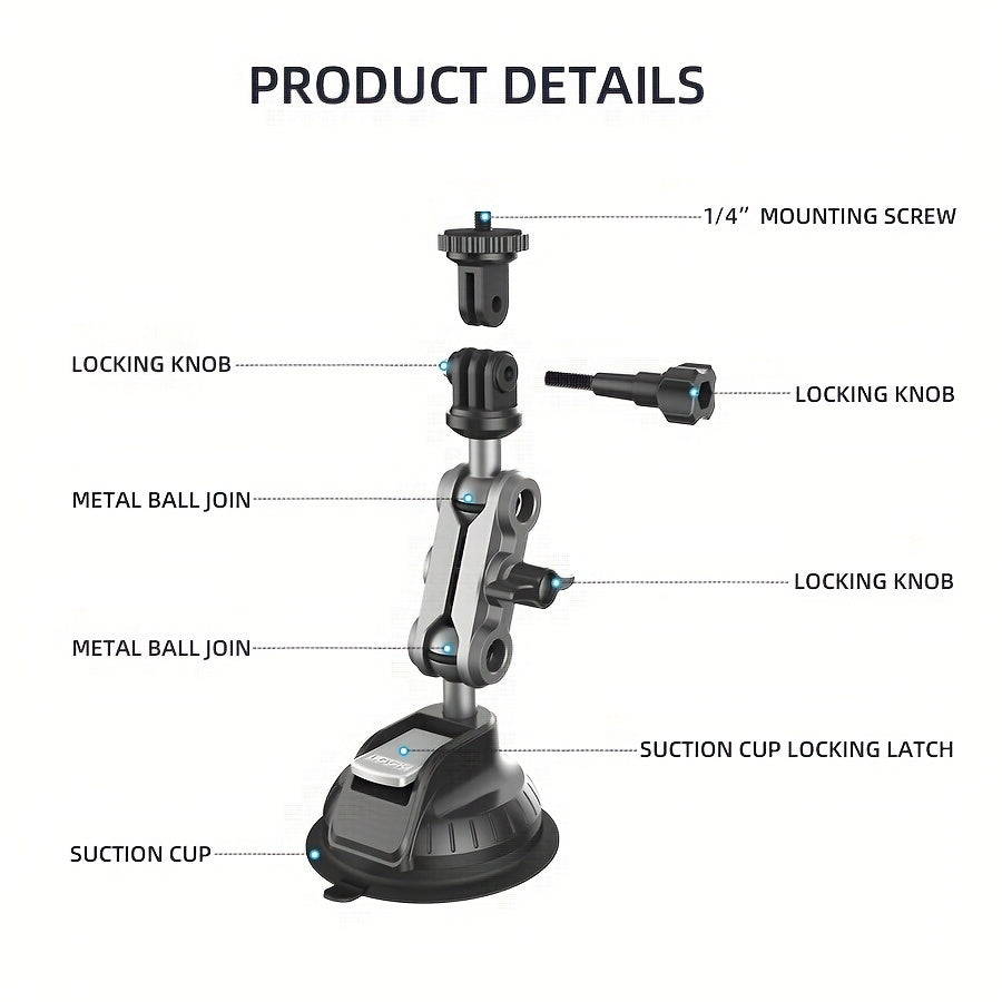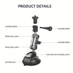 Strong Suction and Reliable: This car mount is constructed with an aluminum alloy body and features a robust nylon suction cup (85mm/3.3in), capable of holding up to 10kg, ensuring strong adhesion and stability. Easy to Install & Additional Features: The suction cup securely attaches with a press, while the knob enables swift and simple adjustment of the camera or phone direction.