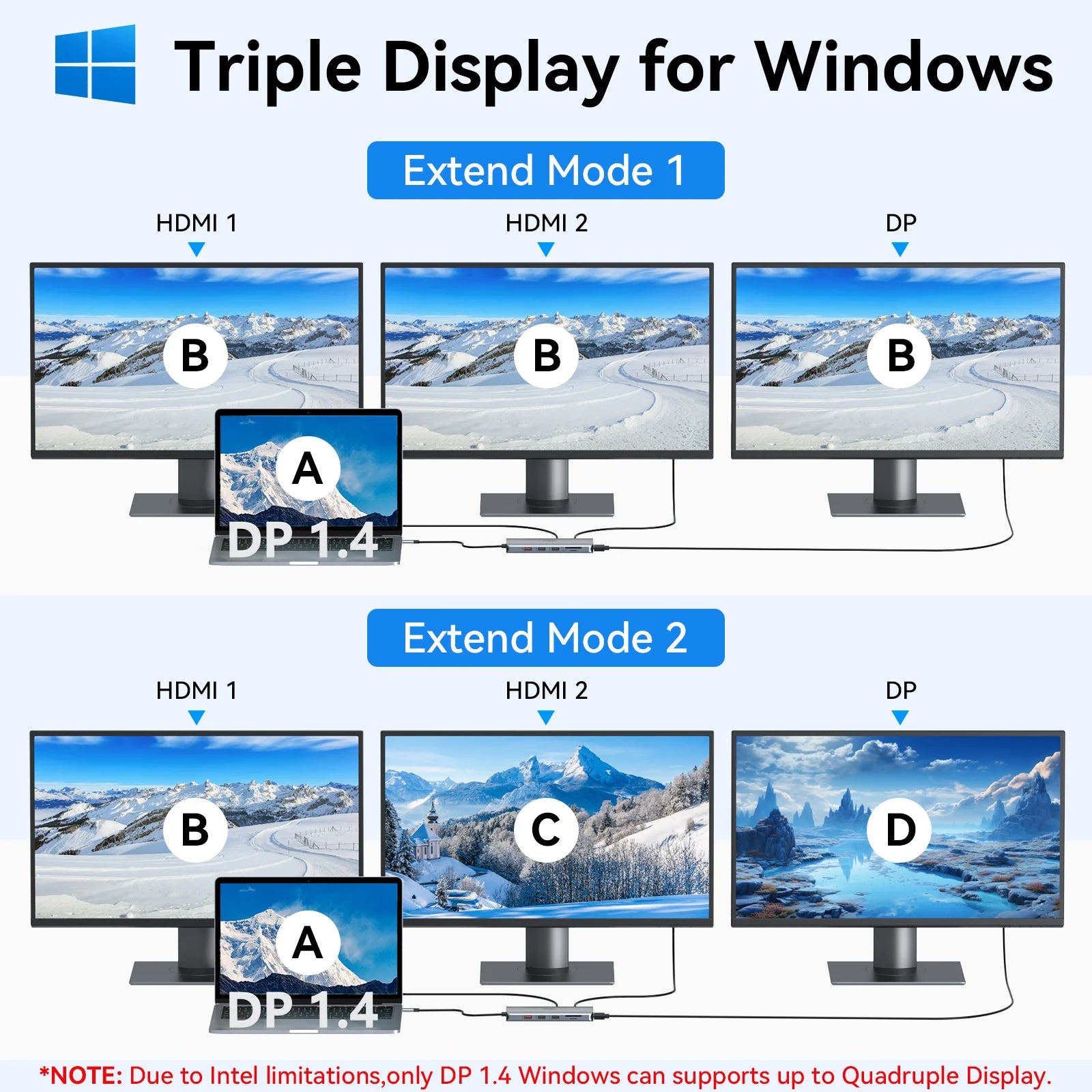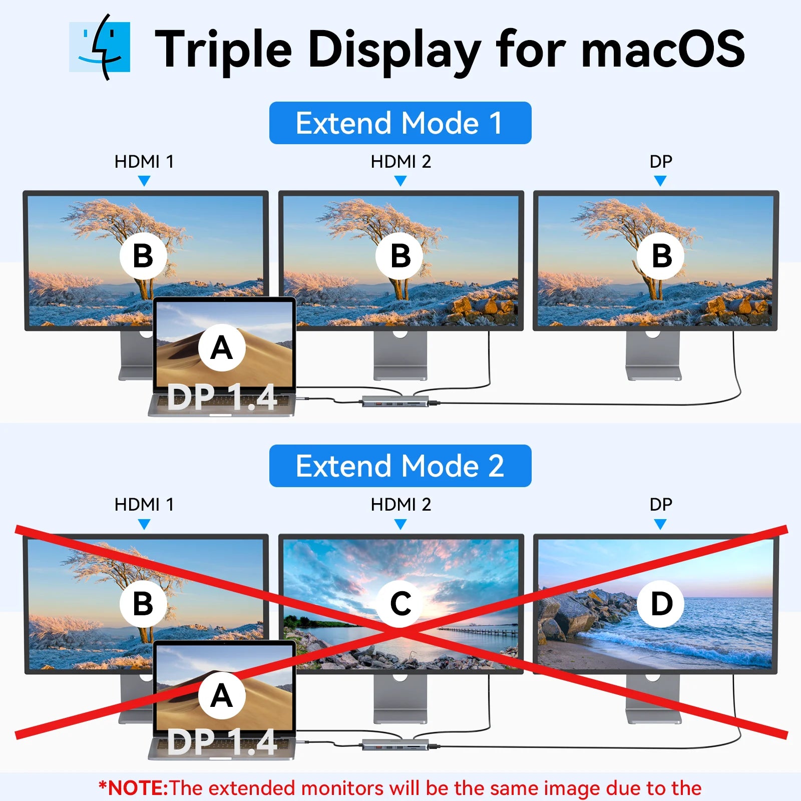 *Note*: Mac OS system doesn't support MST(not support: AABC, ABCD), meaning that when your laptop is Mac OS system, the screens of external monitors are the same, no matter they are displayed in mirror mode or extended mode.