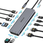 13 in 1:USB C to 2HDMI+DP+2USB C3.1+USB A 3.1+2USB A2.0+RJ45+Audio+SD/TF+PD