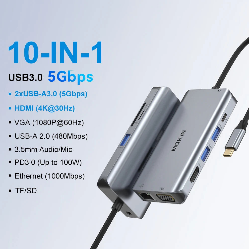 10 in 1:USB C to 4K30Hz HDMI+VGA+3USB3.0+RJ45+Audio+SD/TF+PD