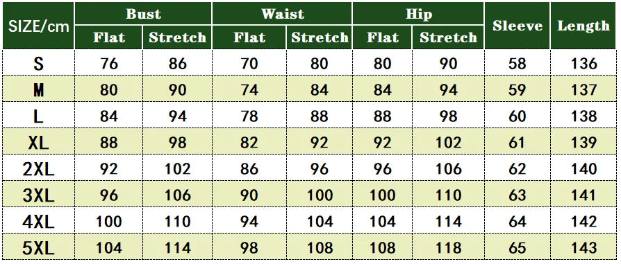 5XL: Bust 104~114 cm,Waist 98~108 cm ,Hips 108~118 cm, Sleeve 65 cm ,Length 143 cm