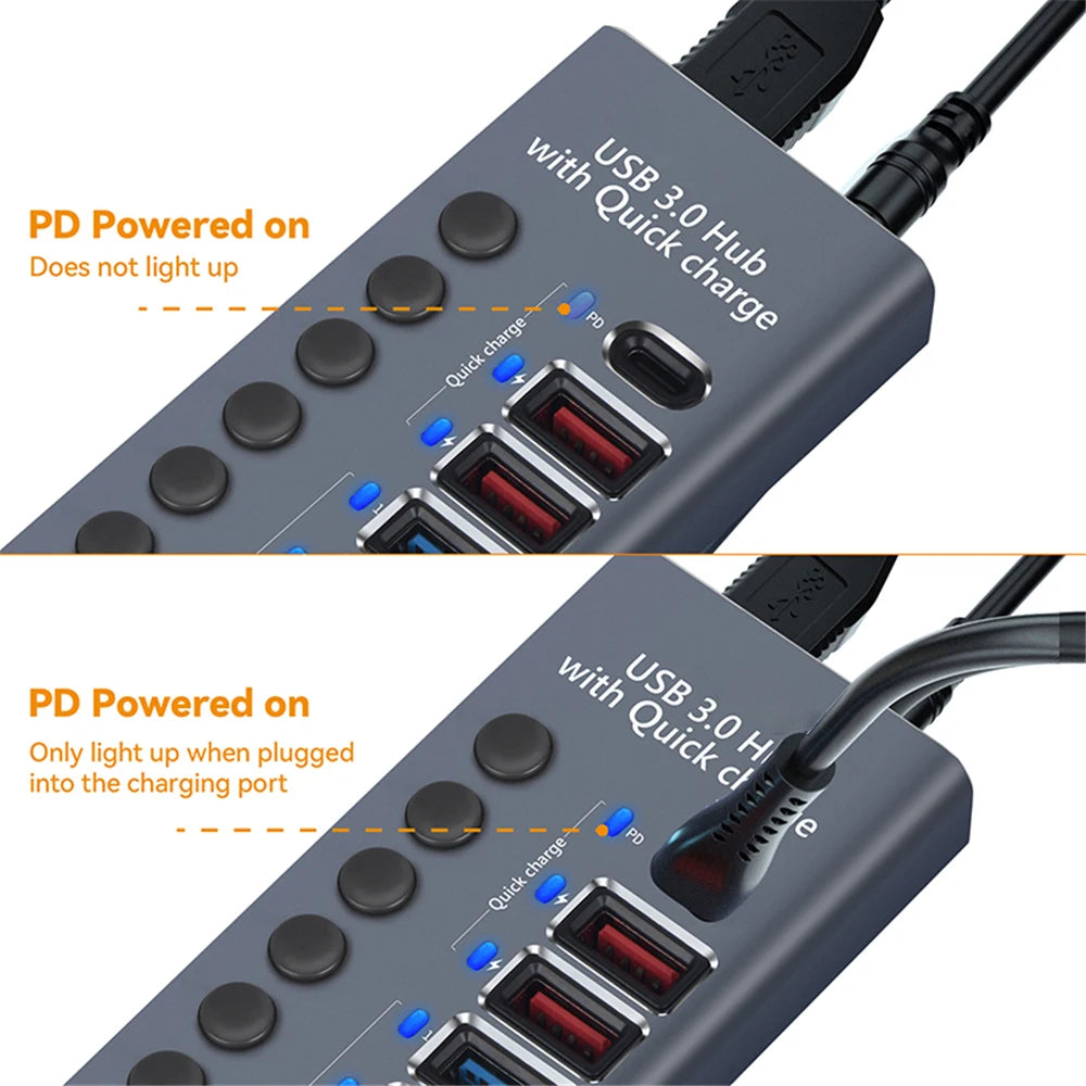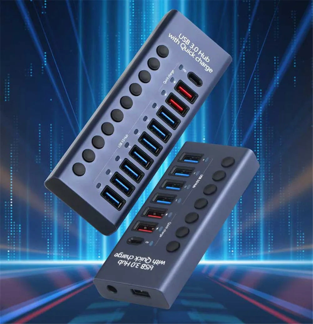 2) HUB985C: Total 10 ports, 7 Ports USB 3.0 Hub, 2 Ports USB A Quick charger, 1 port PD charger, with 60W(12V/5A) power adapter;