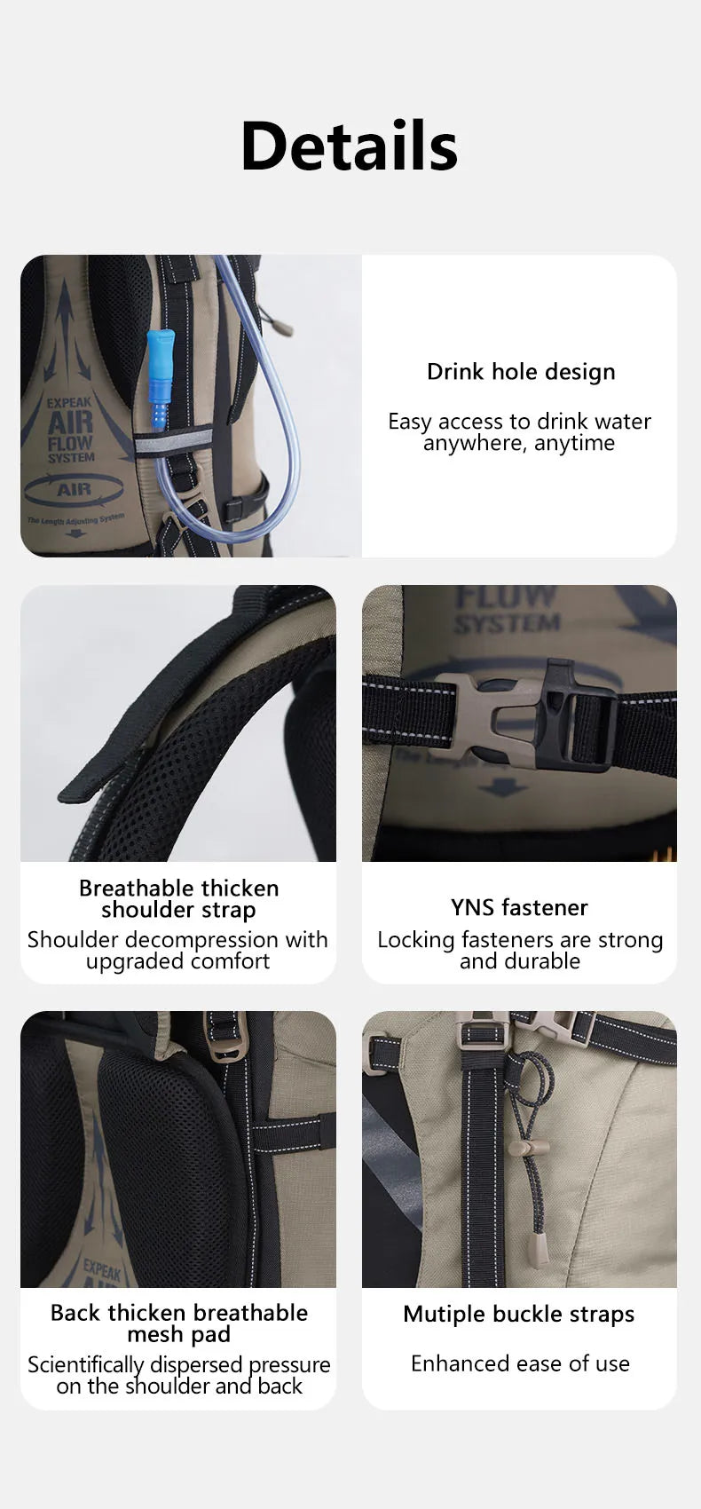 • External Frame Backpack :The external frame design of this backpack allows for easy load distribution and increased support, enhancing your carrying experience.