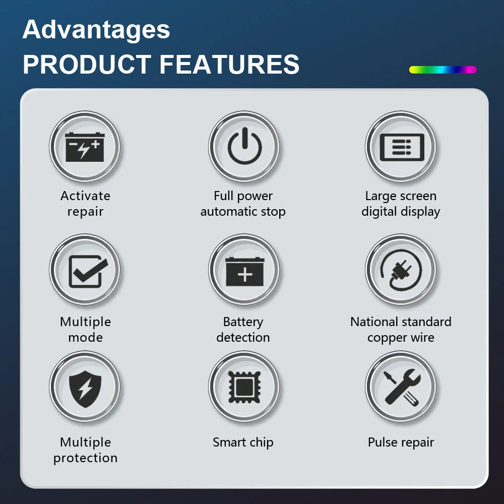 Types of batteries: Most types of lead acid batteries including Calcium, Gel AGM, Wet, lead Acid, LiFePO4,etc..