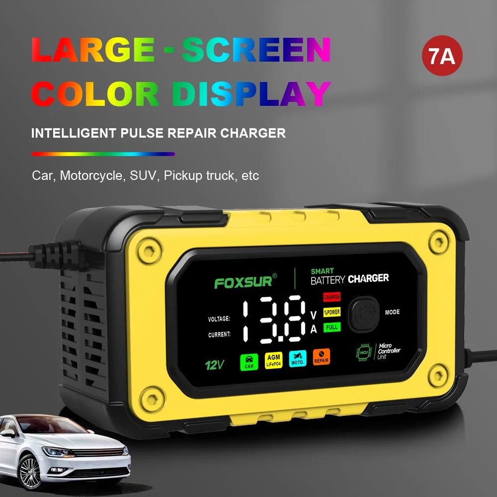 NEW FOXSUR Universal Repair Car Battery Charger 12V 7A Intelligent Repair Motorcycle Charger for lead Acid LiFePO4 Battery