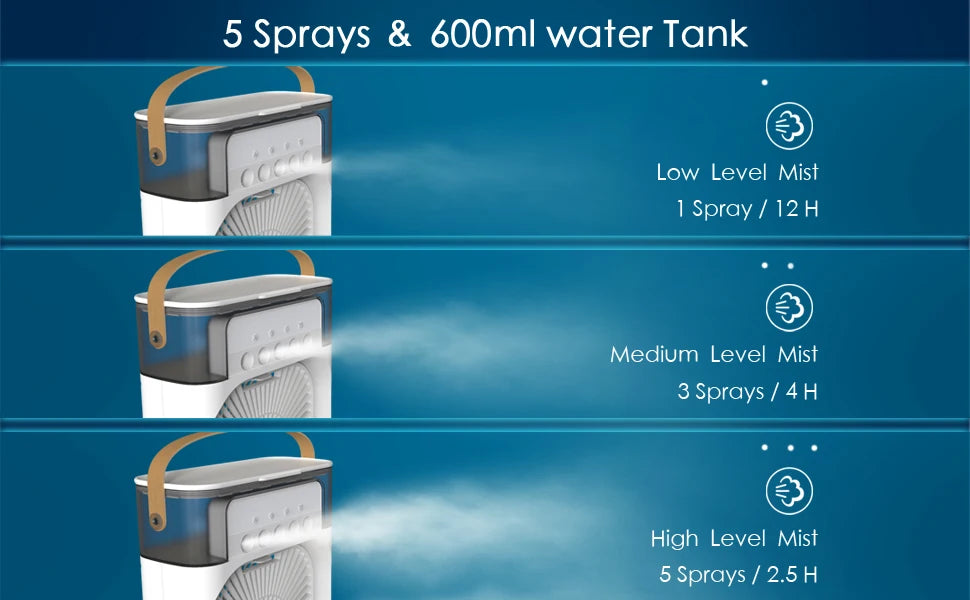 1.This portable low-noise mist fan features a 7-color light design to provide soft lighting.
