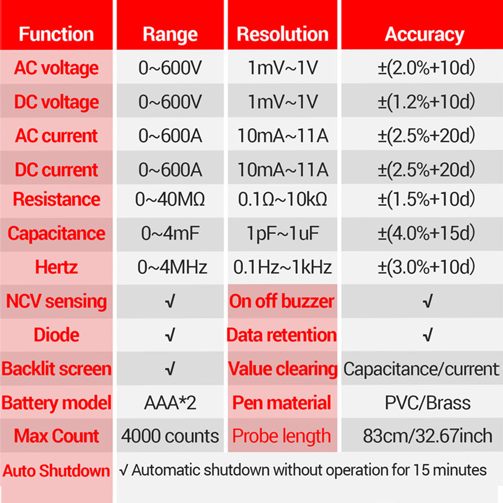 1.AC current 600A non-contact measurement, no need to break the skin non-contact measurement of AC current, automatic range pliers clamped single-stranded wire can be, non-contact safer
