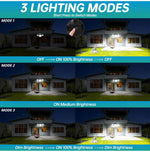 【3 Lighting Modes & Wide Applications】--The button switch controls the 3 modes, and each press switches the following functions in turn: ① Sensor Mode, ② Continuous On Mode, ③ Dim to Sensor mode. These modes satisfy various usage requirements, making it suitable for outside use in backyard, garage, yard, porch, and swimming pools, etc.