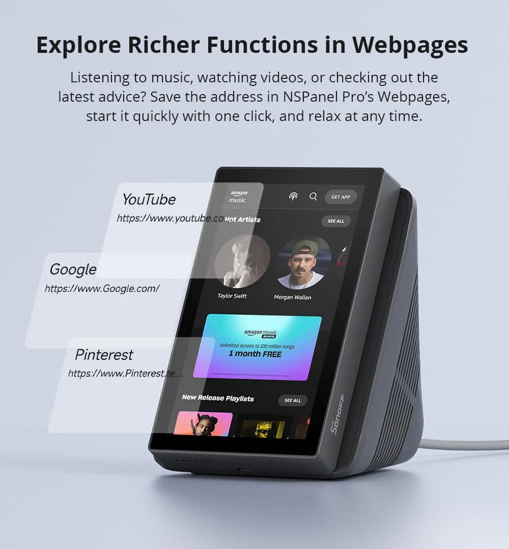 【Explore Webpages】Listening to music, watching videos, or checking out the latest advice? Save the address in NSPanel Pro’s Webpages, start it quickly with one click, and relax anytime.