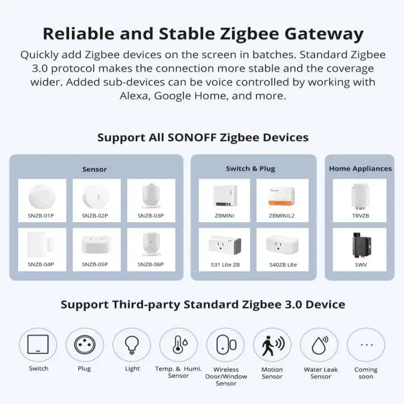 【Built-in Zigbee Hub】 Quickly add Zigbee devices on the screen in batches. The Standard Zigbee 3.0 protocol ensures stable connections and wide coverage. Integrated sub-devices can be voice-controlled via Alexa, Google Home, and more.