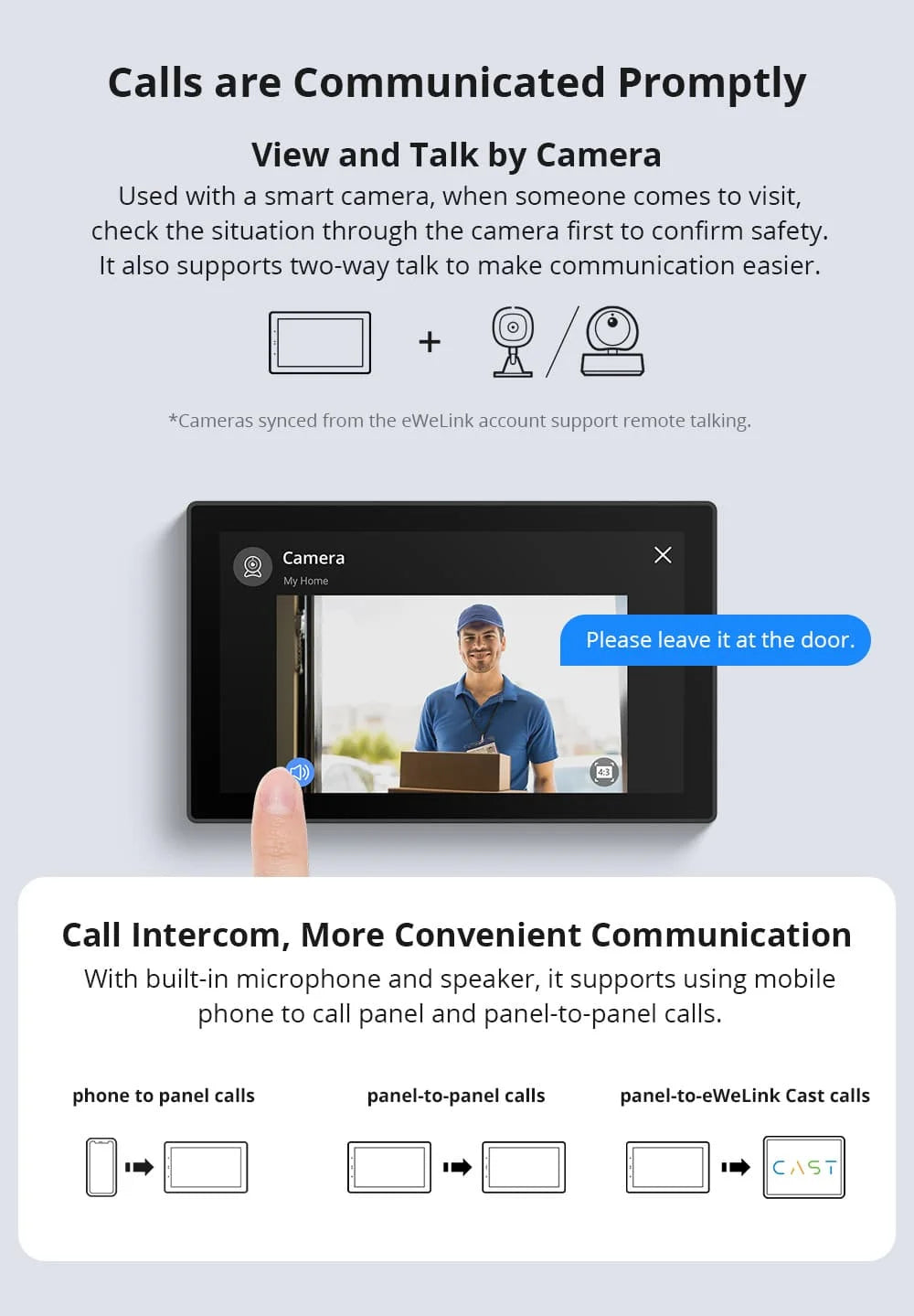You can choose the temperature source and execution devices to form your own thermostat. Keep a suitable room temperature for you. Used NSPanel Pro with a smart camera, when someone comes to visit, check the situation through the camera first to confirm safety. It also supports two-way talk to make communication easier. NSPanel Pro With a built-in microphone and speaker, it supports using mobile phones to call panel and panel-to-panel calls.