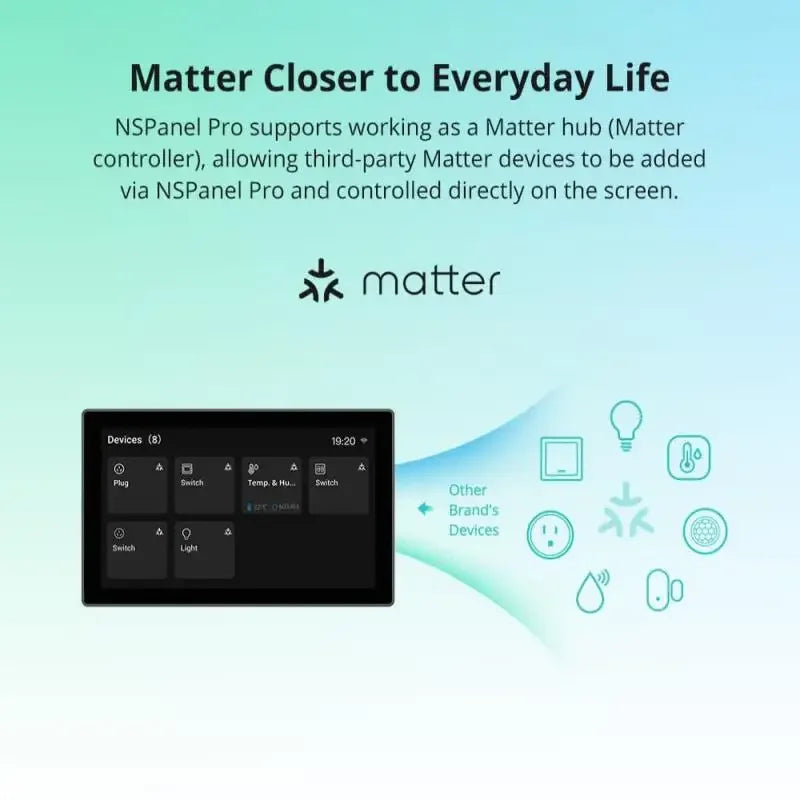 NSPanel Pro 120 Type can be used as a Matter hub (Matter controller), allowing you to add Matter switch, socket, sensor,etc devices from different manufacturers to the eWeLink APP for management and control, it also supports adding the Matter bridges from different brands. Enhances NSPanel Pro's compatibility with third-party devices.