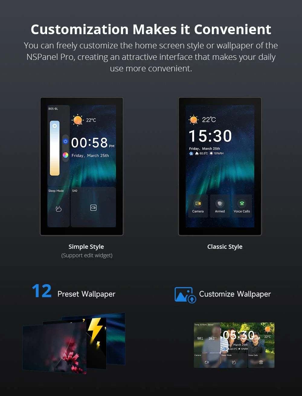 You can quickly add Zigbee devices on the NSPanel Pro in batches. Standard Zigbee 3.0 protocol makes the connection more stable and the coverage wider. Added sub-devices can be voice-controlled by working with Alexa, Google Home, and more. You can customize 3 modes by setting different arming devices. After arming, once the sensor is triggered, the panel will alarm, and you will receive a notification alert on the phone. You can freely customize the home screen style or wallpaper of the NSPanel Pro, creating an attractive interface that makes your daily use more convenient.