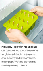Easy to Release Popsicles: Silicone material makes this ice pop maker easier to pull out than plastic or stainless steel Popsicle molds. Base tray with anti-slip protruding handles and soft silicone lid, so you no longer have to worry about that Popsicle mold slipping or ingredient fluid dropping when taking it into the freezer