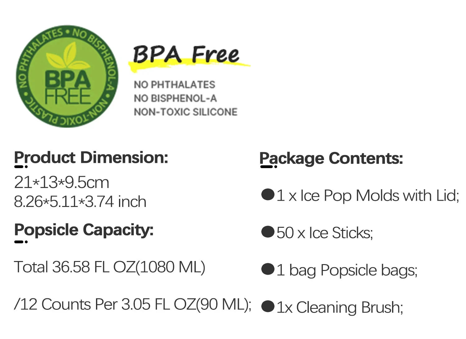 Unique 12 Popsicle Maker Molds: Popsicle molds for kids measures 8.26*5.11*3.74 inch, with 12 individual 3.05OZ cavities(90ML), which ensure you make different taste ice pops at one time, absolutely satisfy your big desire for ice cool treats in hot summer