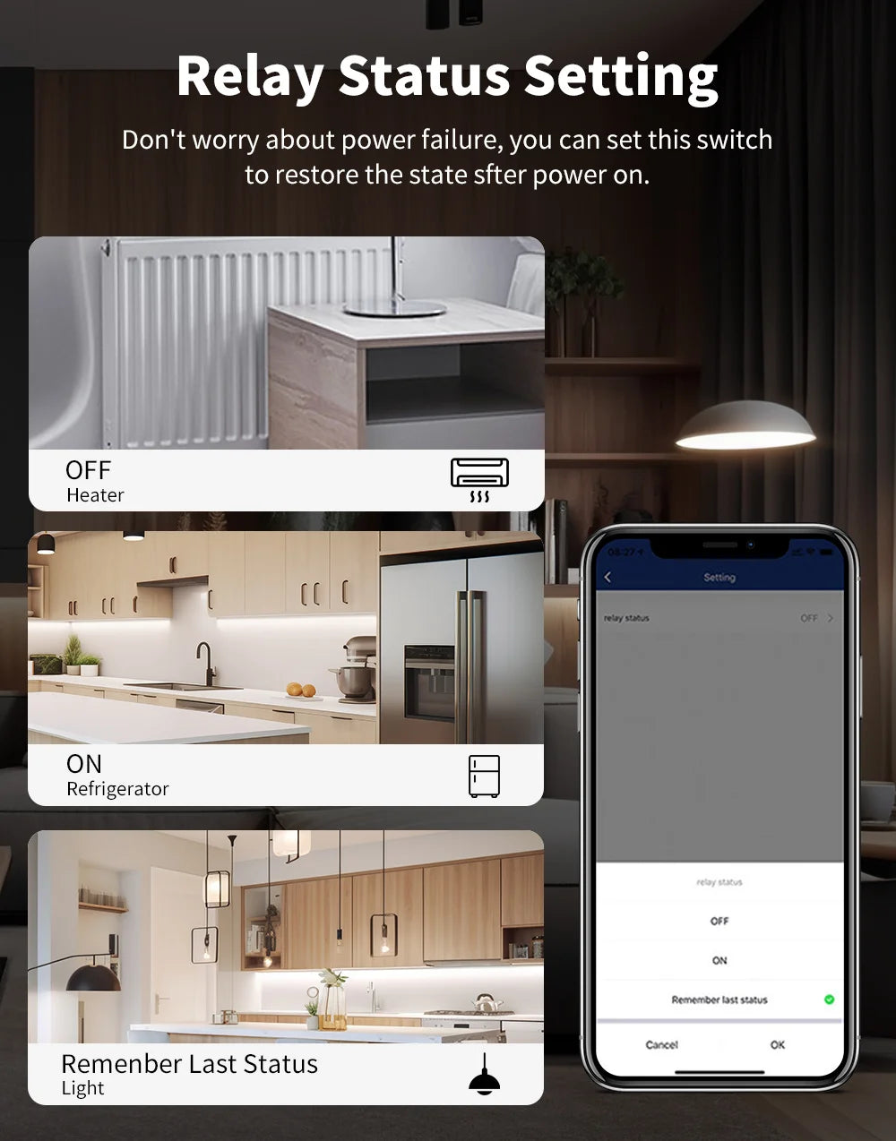Never worry about power failure, you can set this switch to restore the state after power on.