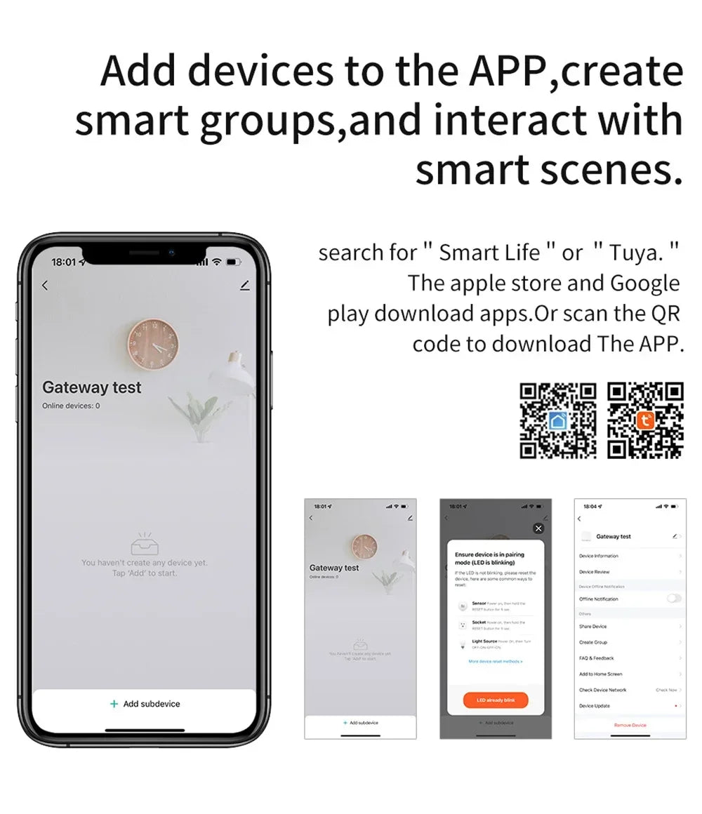 3.Control sub-devices of the gateway, supporting remote control for connected Bluetooth and ZigBee smart devices in Smart Life App as multi-protocol.