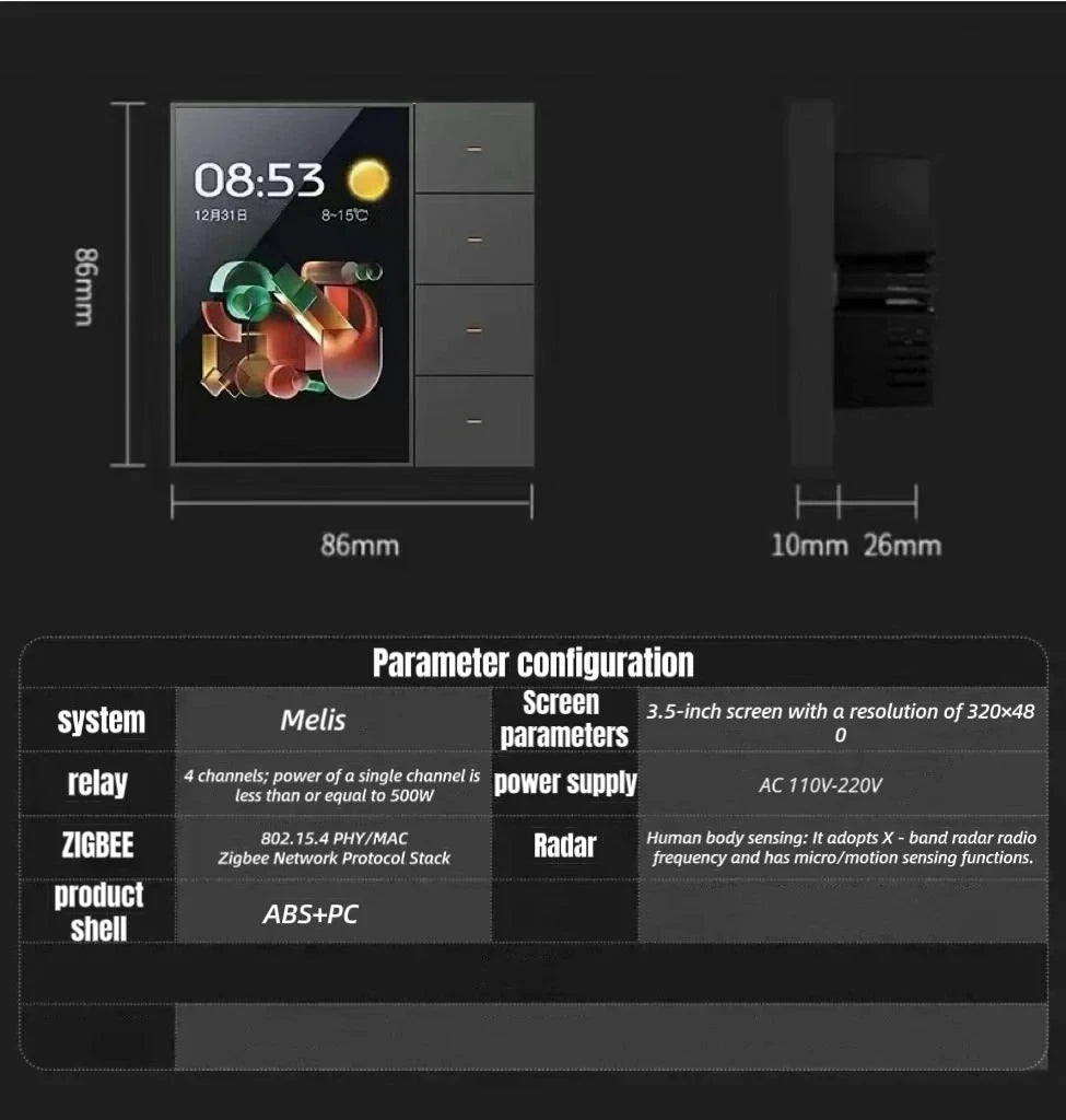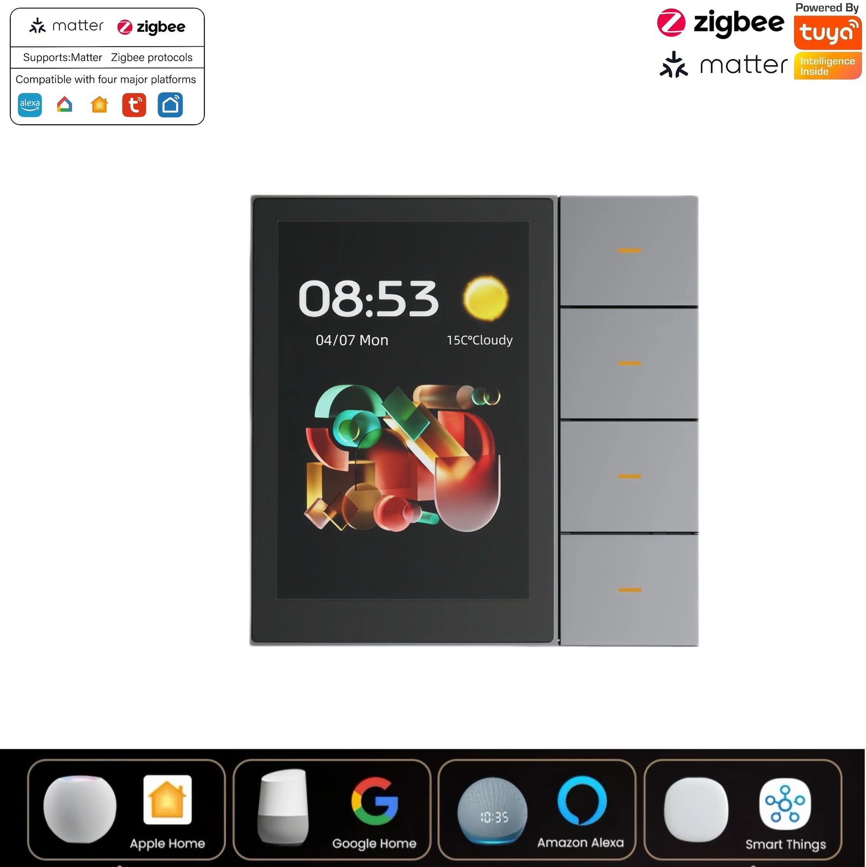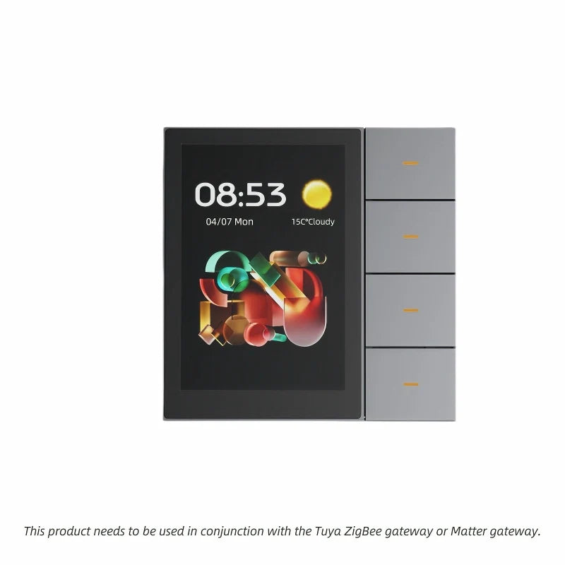 The F3-Pro is a premium smart switch designed for high-end smart home systems. Built on the Tuya Smart Platform and equipped with Zigbee 3.0 + Matter protocol, it seamlessly integrates with Apple HomeKit, Google Home, Amazon Alexa, and other major smart ecosystems. Featuring a 3.5-inch HD touchscreen, tactile physical buttons, and millimeter-wave radar sensing, this hub combines lighting, curtain, scene, and dimming controls into one sleek device – the ultimate centerpiece for whole-home automation.