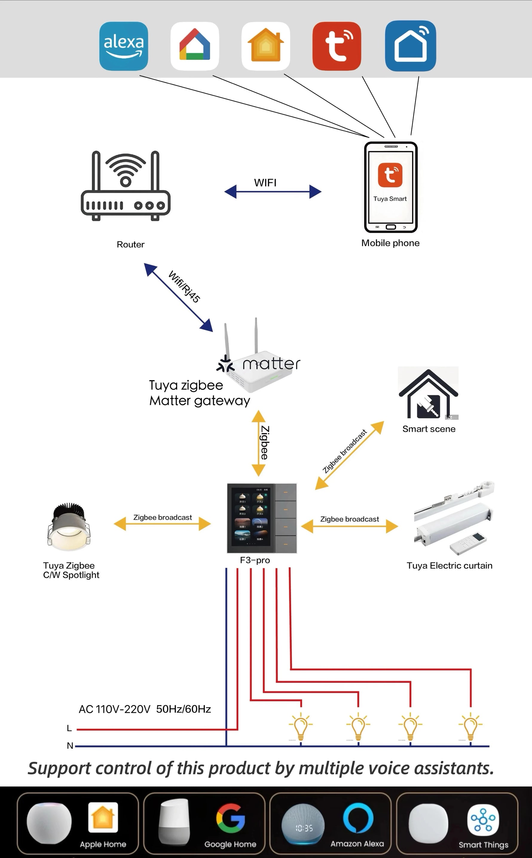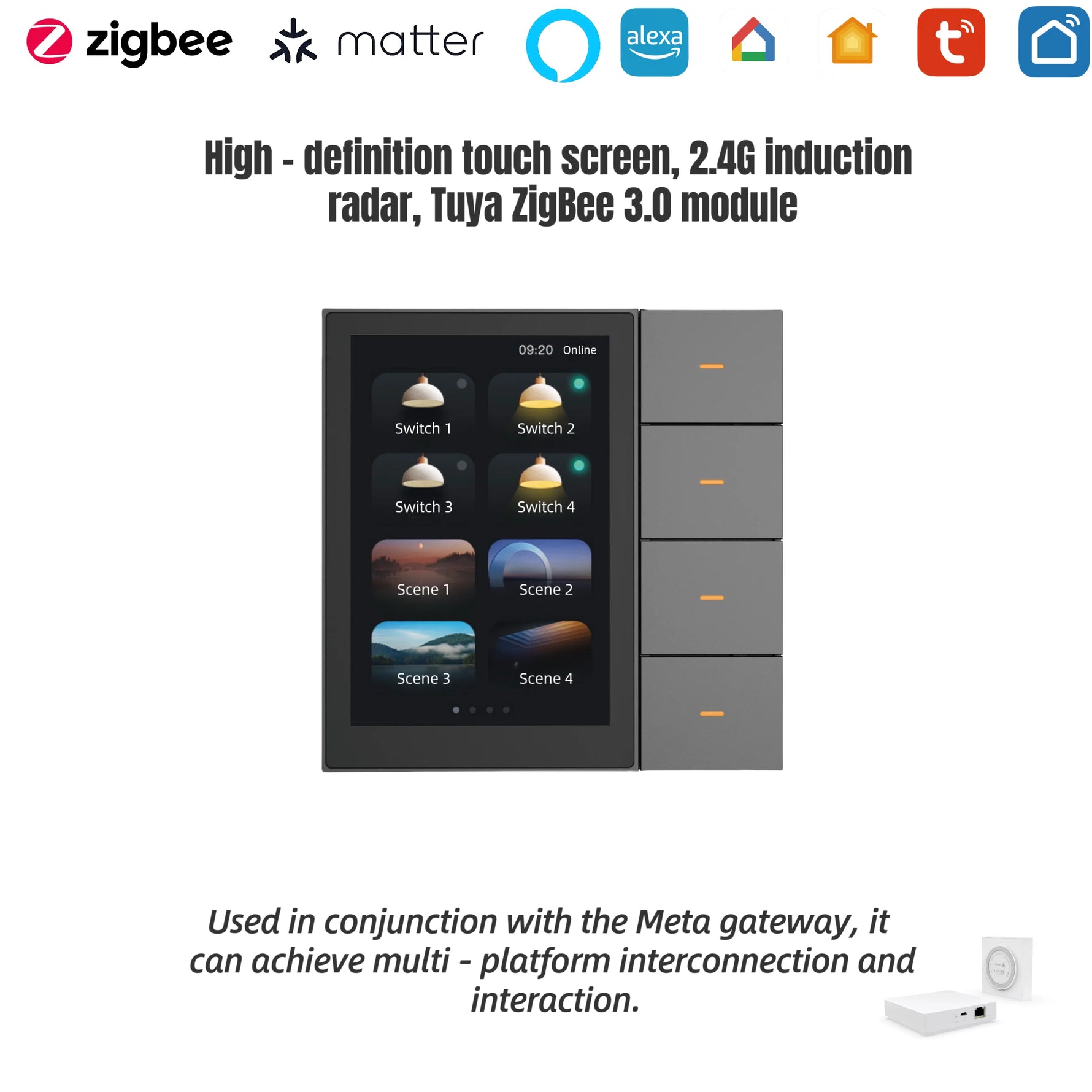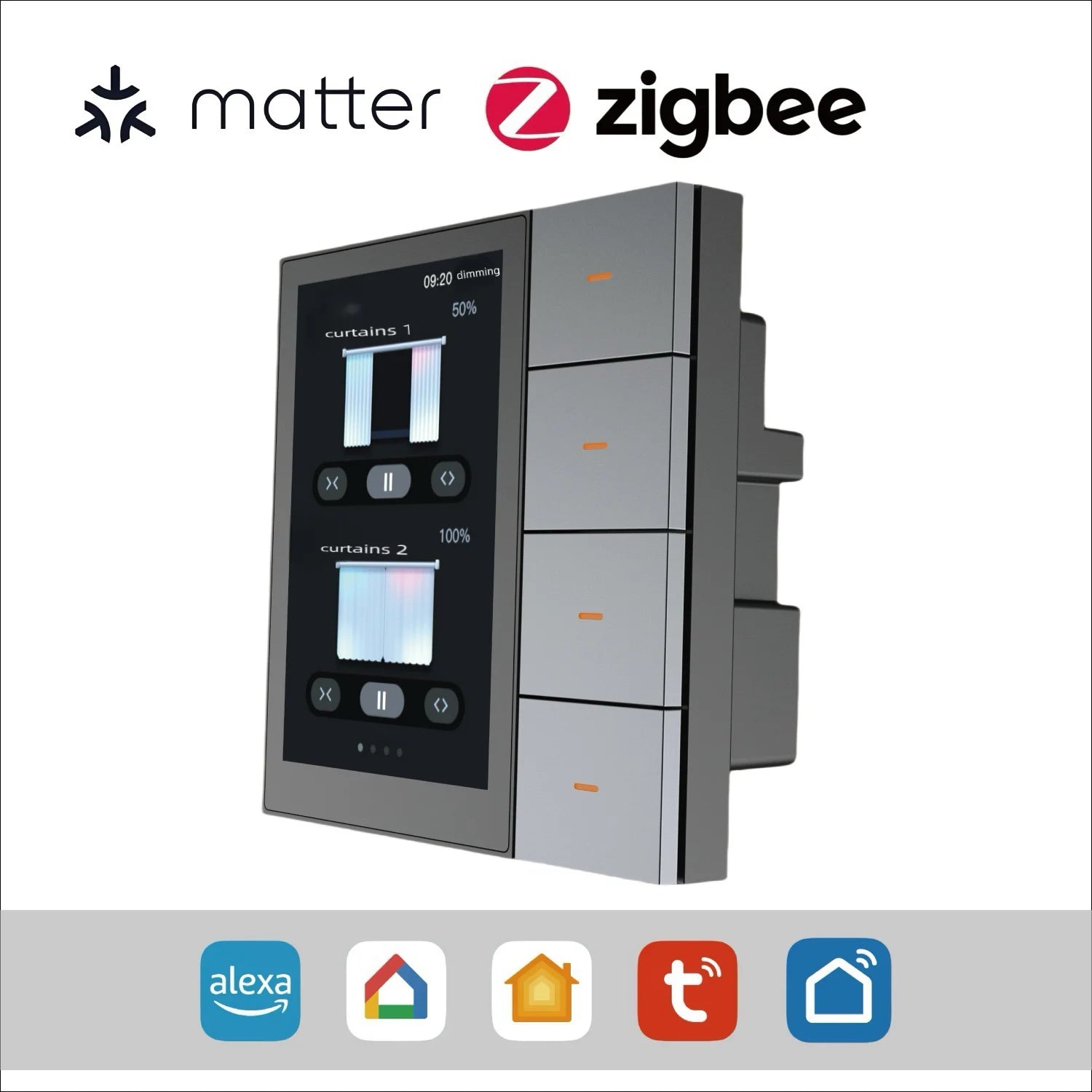 The F3-Pro is a premium smart switch designed for high-end smart home systems. Built on the Tuya Smart Platform and equipped with Zigbee 3.0 + Matter protocol, it seamlessly integrates with Apple HomeKit, Google Home, Amazon Alexa, and other major smart ecosystems. Featuring a 3.5-inch HD touchscreen, tactile physical buttons, and millimeter-wave radar sensing, this hub combines lighting, curtain, scene, and dimming controls into one sleek device – the ultimate centerpiece for whole-home automation.