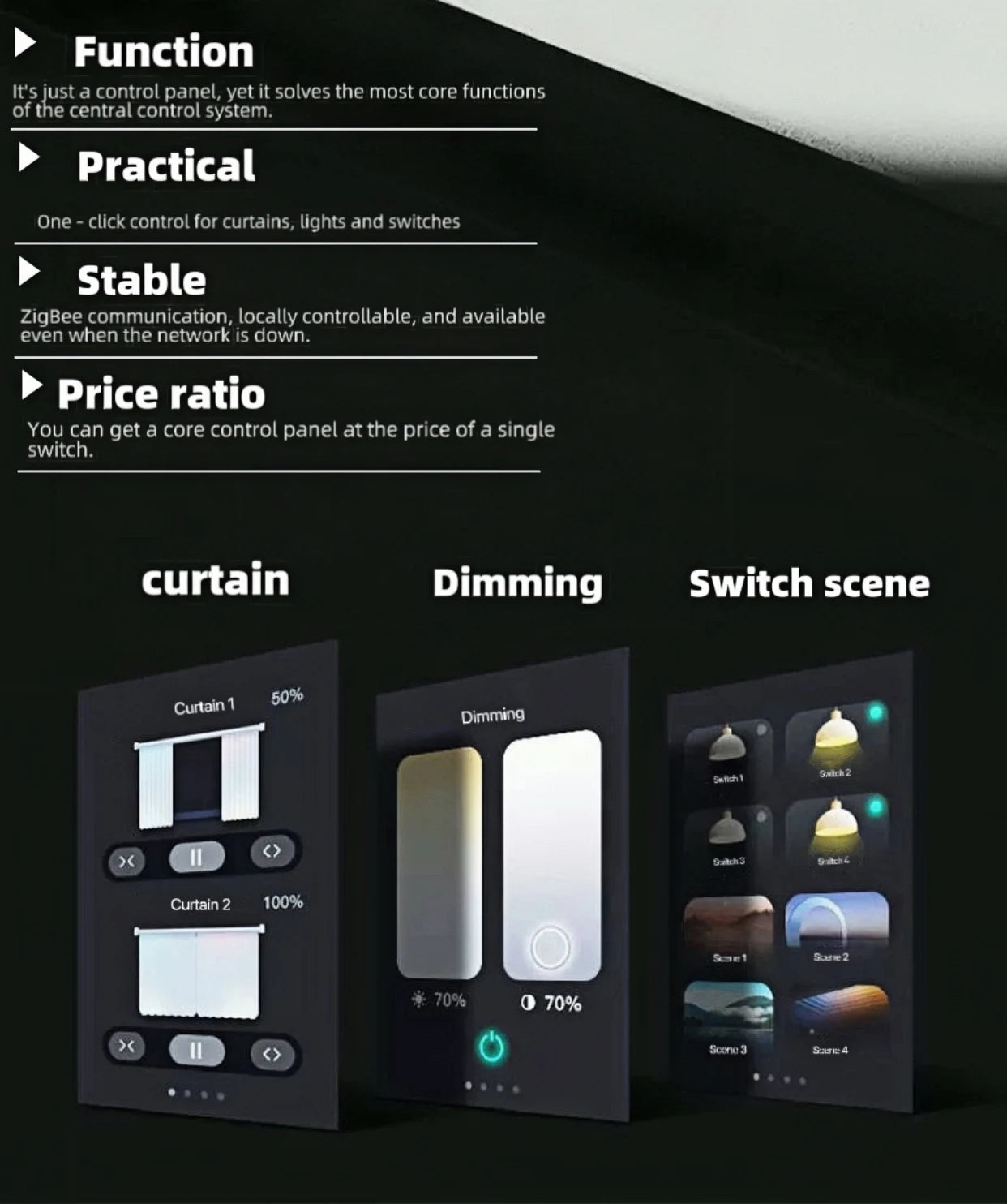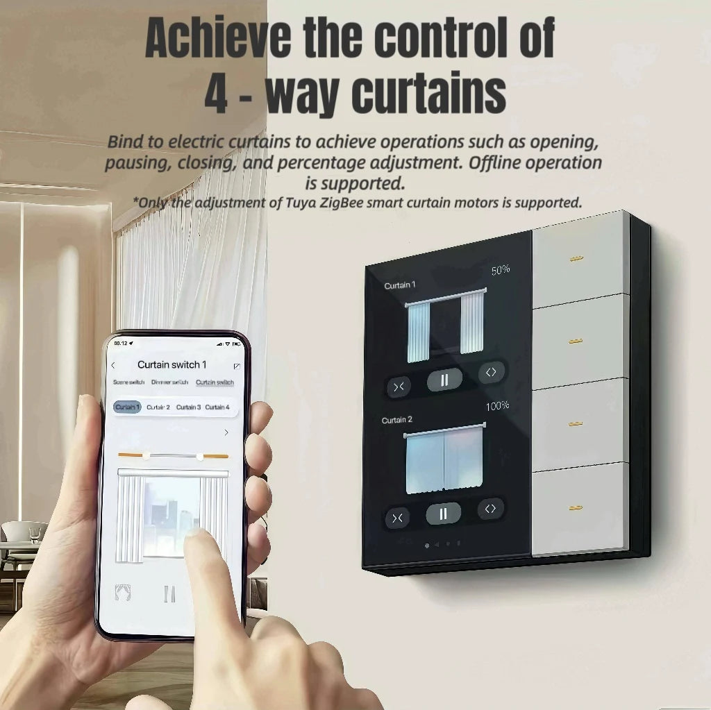 ✅【4-in-1 Multifunctional Hub】 4 switches (500W per circuit) + 4 curtain controls + 4 dimming channels + 8 scene modes – manage lights, appliances, motorized curtains, and smart dimmers simultaneously.