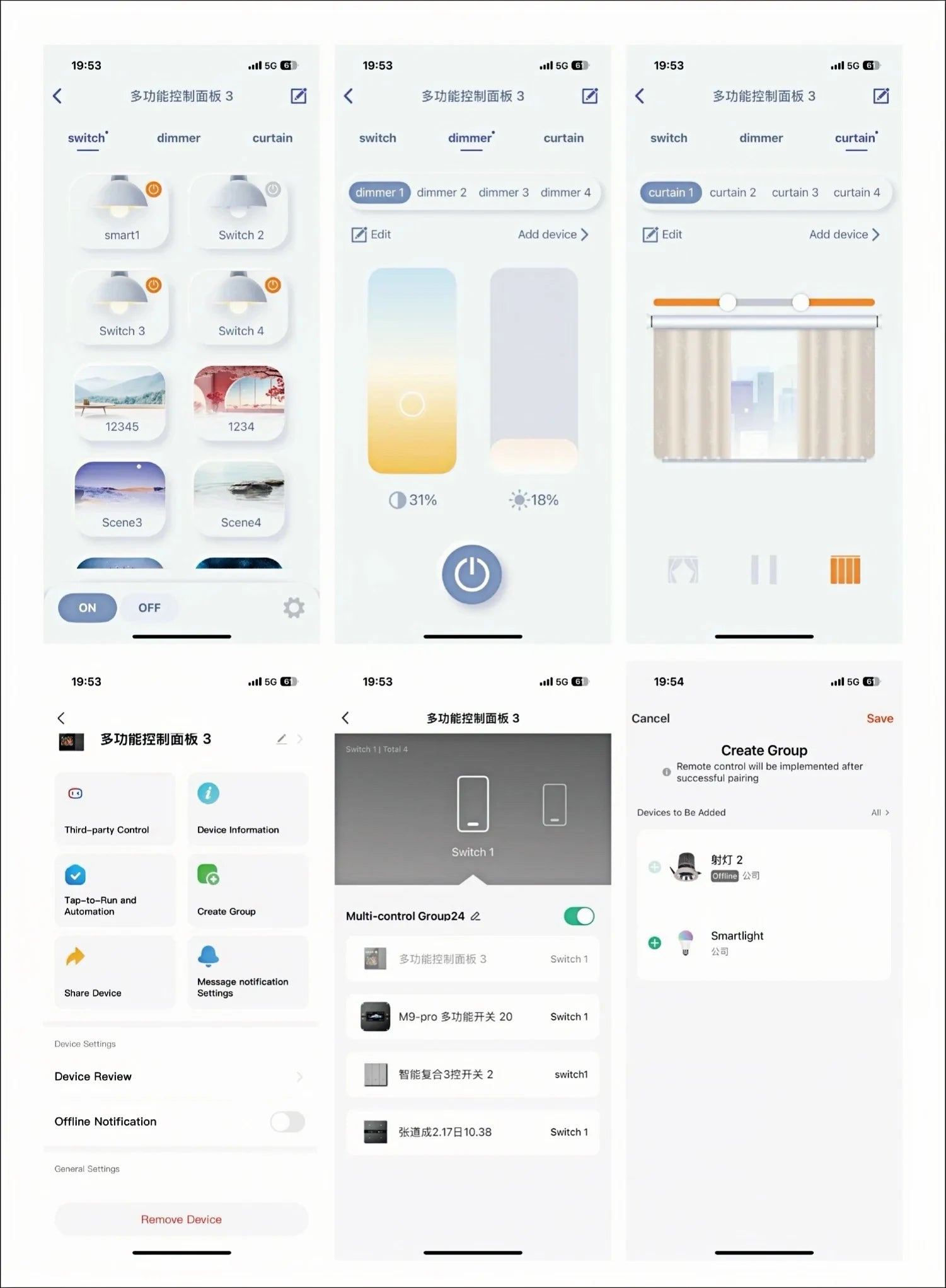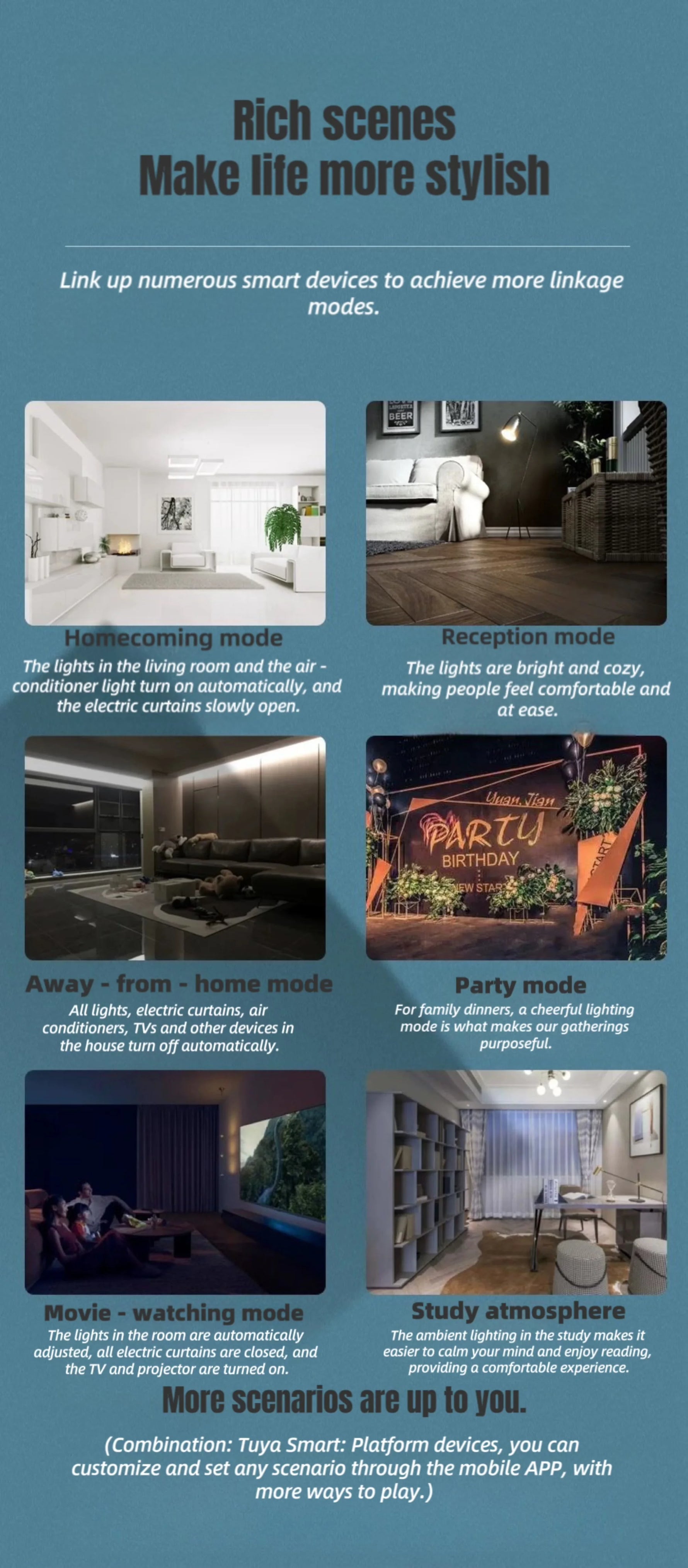 🌙Morning Routine: Tap "Good Morning" → Curtains open 30% + lights fade to 4000K warm white 🚪Away Mode: Radar detects no motion → Lights off + appliances standby + security arm 🎥Movie Night: One-touch scene → Curtains close + lights dim + projector powers on 💤Sleep Mode: Double-tap screen → Gradual lights off + AC enters night mode