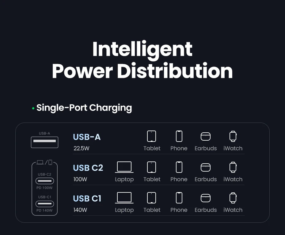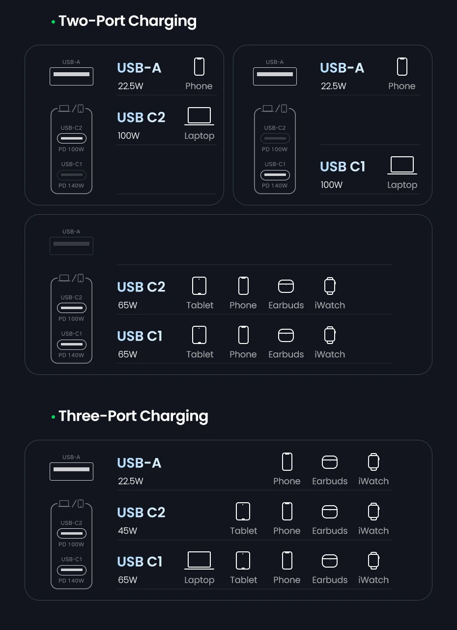 USB-C 1/USB-C 2+USB-A: 100W+22.5W