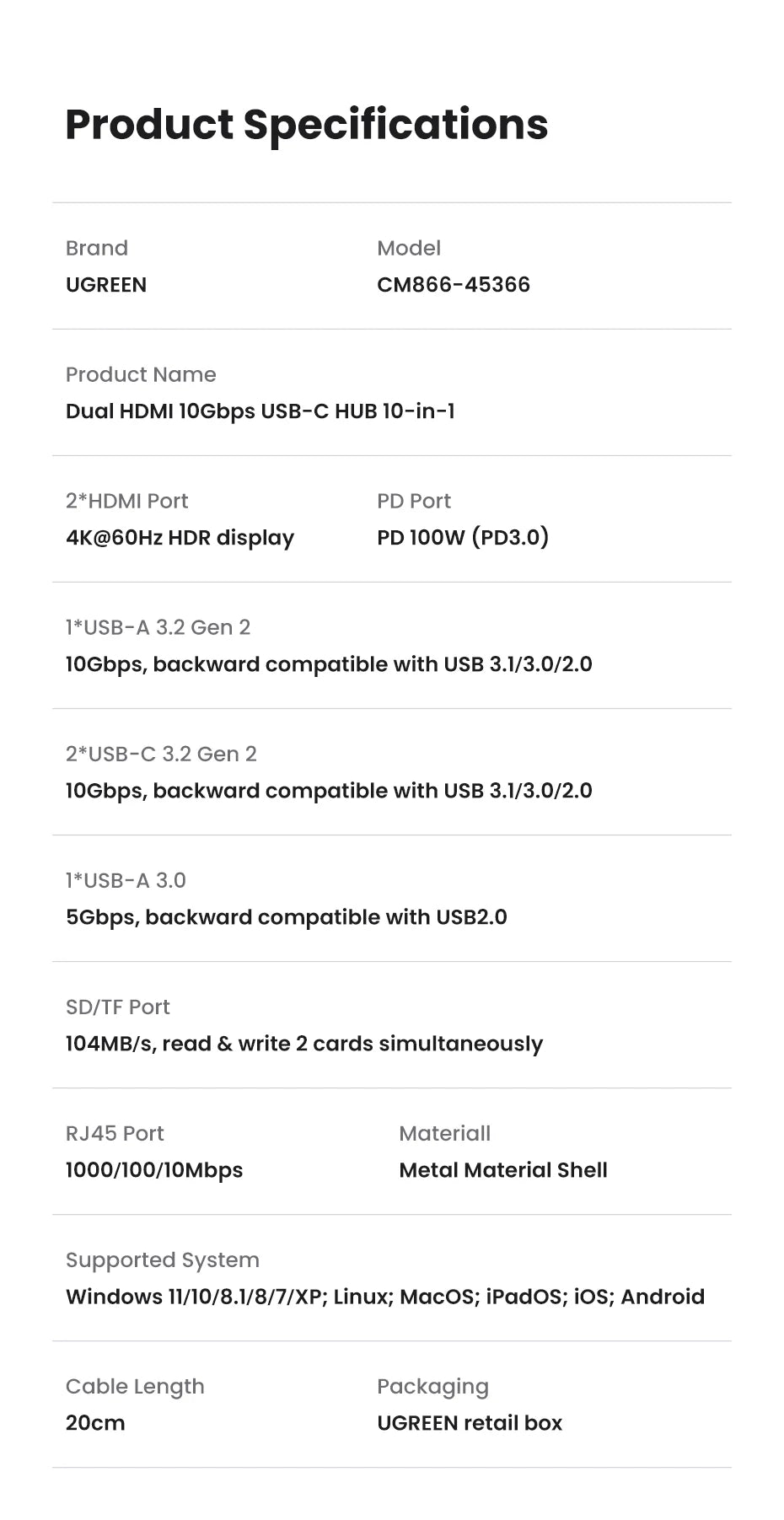 UGREEN USB C HUB 10Gbps 4K60Hz HDMI USB3.2 PD100W USB Splitter for Laptop Macbook Pro Air iPad Phone Android Docking Station