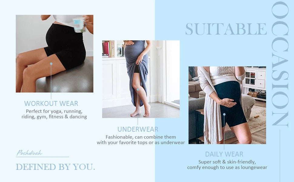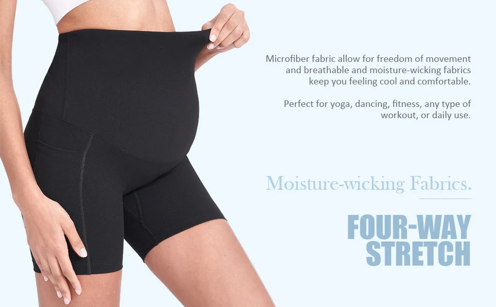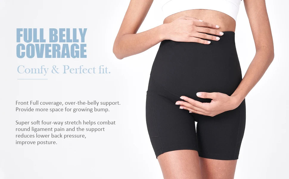 Soft Stretch Fabric: These maternity biker shorts provides gentle back support as your belly grows with no slipping or digging in at the belly. Maternity active shorts stay in place for high intensity workouts withouting pulling no need to tug and pull them up at all.
